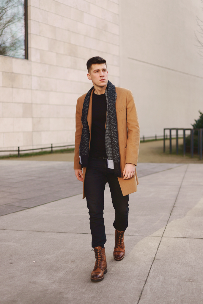 The men’s beige coat belongs to the classic style. All elements of the set, i.e. trousers, shoes, jacket, or sweater must be in a casual or elegant style. Also remember that the camel coat does not match with everything! In my opinion, it goes best with black, unlike most brown coats that do not go well with black. Camel colour is a delicate shade of brown, so it contrasts well with deep black. A dark-brown coat looks bad with black, This is an important rule that you should remember. The camel coat has different cuts, but the most traditional has wide skirts, is single or double-breasted and reaches mid-thigh. In women’s versions, camel coats are much longer, reaching up to half of the calves. They are worn with boots or elegant leather boots.